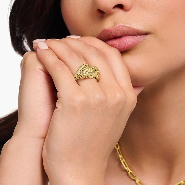Это кольцо Томас Сабо в форме, как крокодиловый подъем, сделанный в законе серебра 925 с ванной 750 желтого золота. Это 3D -эффект с тонкими гравировальными линиями и черными и изумрудными камнями с зеленым цирконитом в руке. Это стоит 549 евро.